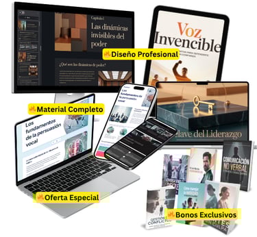Si deseas llevar tus habilidades de defensa personal y asertividad al siguiente nivel, no solo obtienes el ebook principal "Voz Invencible", sino que también te llevas 6 bonos adicionales que te ayudarán a dominar todos los aspectos de la comunicación efectiva, desde el lenguaje corporal hasta la gestión emocional.